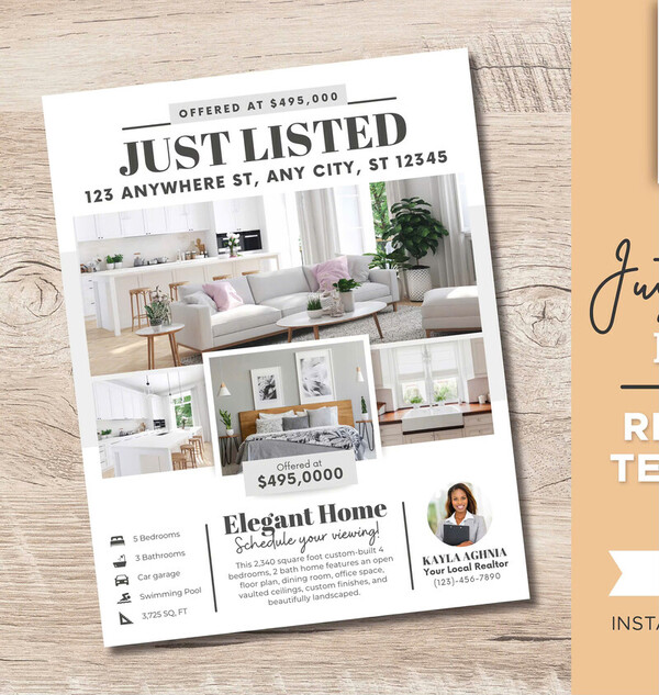 Use one strong image, keep text minimal, add a QR code, and make the CTA obvious (call / book appraisal / view listing).